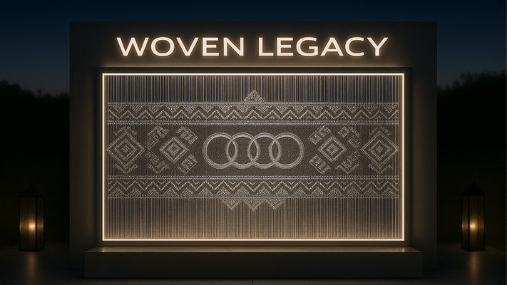 Set beneath shimmering lights and framed by metallic iridescent panels, Woven Legacy is a participatory installation that brings Audi’s heritage to life through the lens of a local tradition. Guests are invited to sit together on low poufs and cushions, contributing to a large-scale, evolving tapestry that gradually reveals traditional Sadu patterns, an emblem of regional craftsmanship, subtly interlaced with the Audi rings.