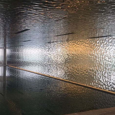 A quiet centerpiece within the experience, this shallow water installation features a sculptural rendition of the Audi four-ring logo: floating, weightless, yet resolute. Precision lighting above casts its silhouette as a shadow onto the surrounding walls, gently refracted by the rippling surface of the pool.