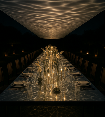 This spatial concept is built around a sense of quiet impact, where light, form, and material come together to create an experience that feels both grounded and elevated. Think sculptural simplicity, layered reflections, and gentle interactions between light and surface. Polished metal, tinted acrylic, and translucent finishes are paired with soft ambient glows, inviting guests into a world that feels serene but alive. These elements don’t shout, they speak in gestures: a shimmer, a shadow, a ripple across the floor.