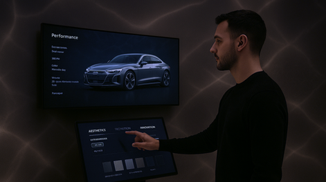 In a sleek, tech-forward zone within the main event space, guests are invited to step into the Audi Configuration Space, a reflective interactive pod or kiosk where they can digitally craft their ideal Audi.